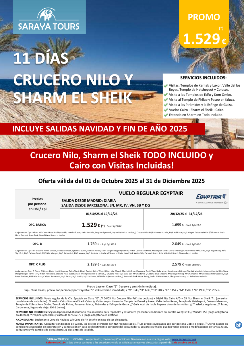 Crucero Nilo y Sharm el Sheik 11d Salida dsd Mad y Bcn *Crz, Sharm en T.I. y Cairo con Visitas* hasta Sept26