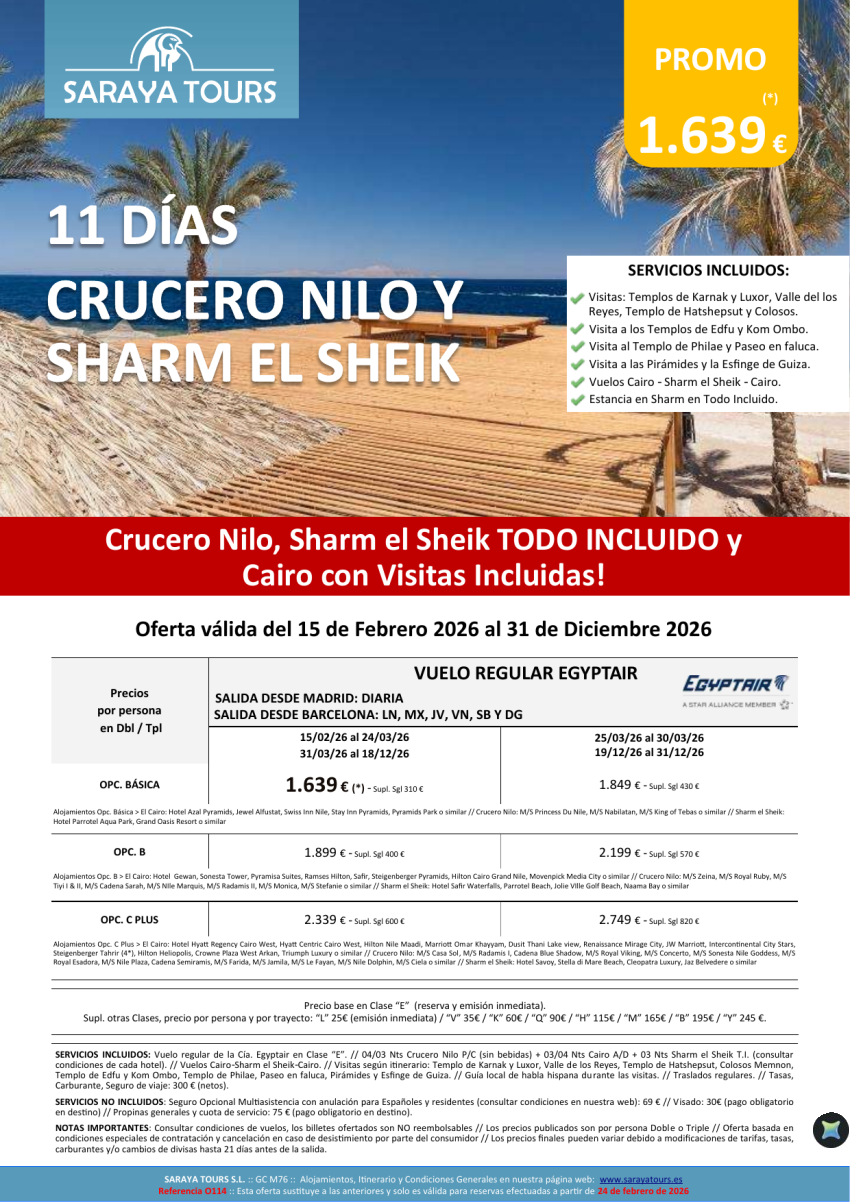 Crucero Nilo y Sharm el Sheik 11d Salida dsd Mad y Bcn *Crz, Sharm en T.I. y Cairo con Visitas* hasta Dic26