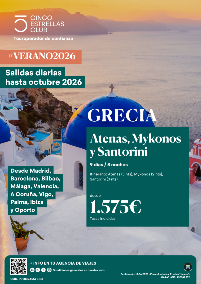 Oferta Atenas,Mykonos y Santorini sal.diarias 9ds/8ns dsd 1.575€ dsd Mad,Bcn,Bio,Agp,Vlc,Lcg,Vgo,Pmi,Ibz,Opo